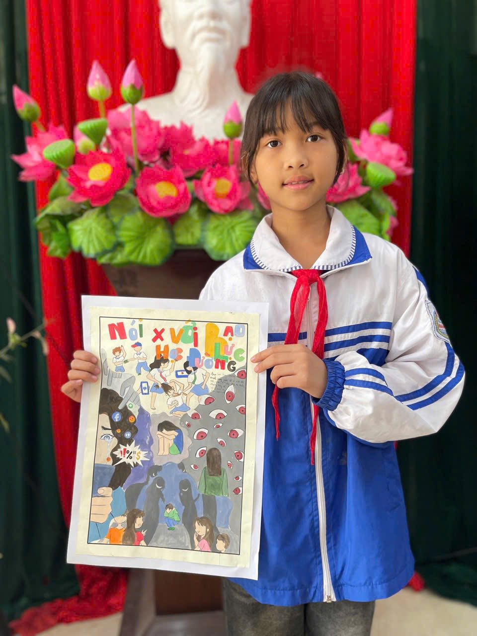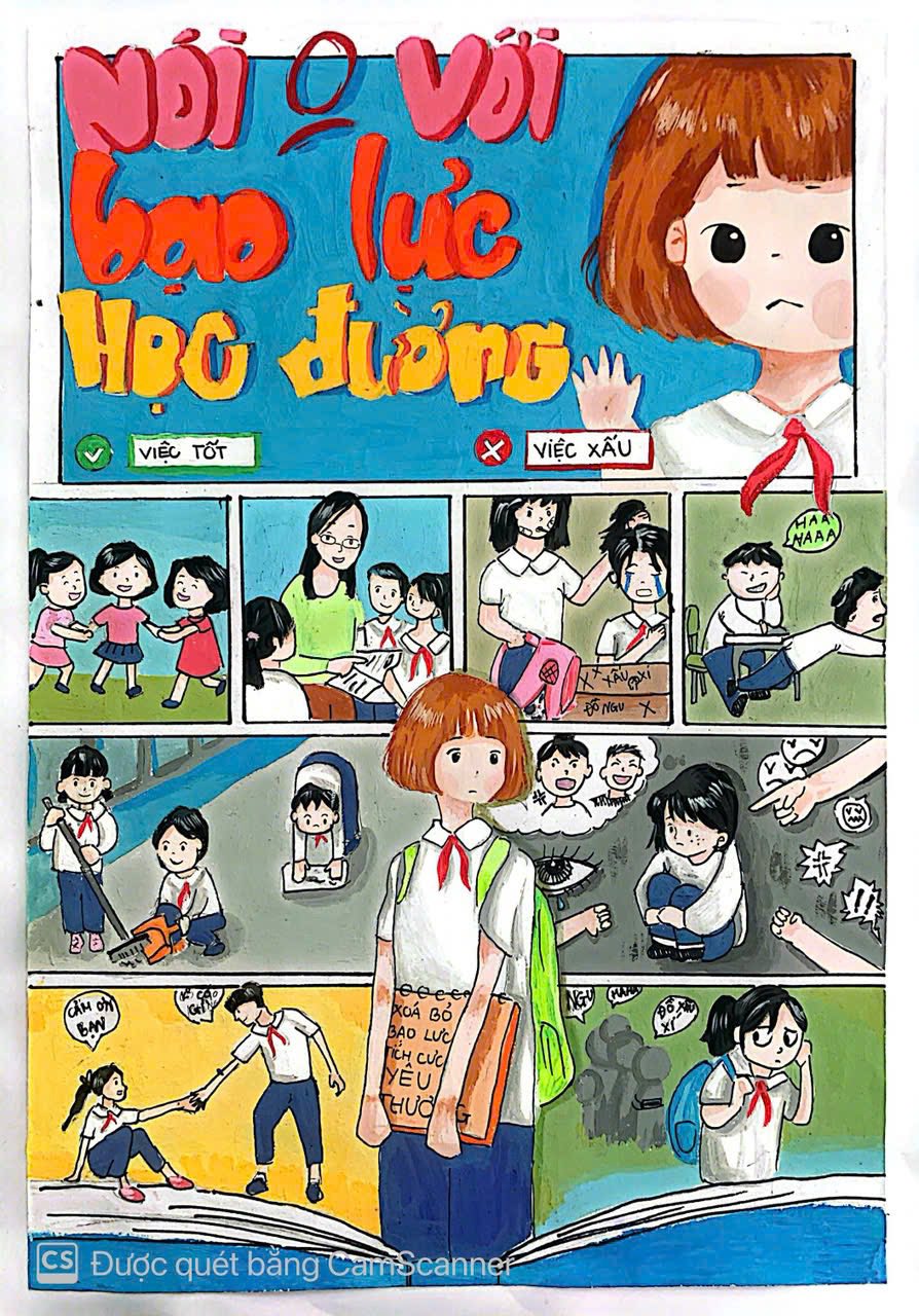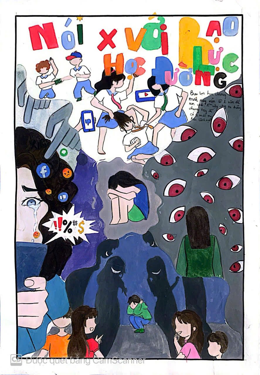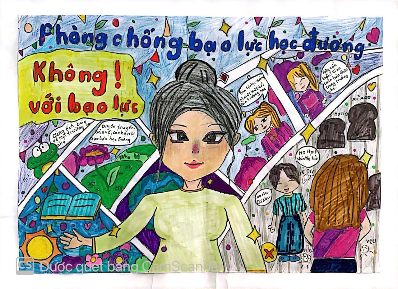 Các tác phẩm cũng mạnh dạn truyền tải thông điệp nói không với bạo lực học đường bằng những hình ảnh sinh động, giàu ý nghĩa. Nhiều bài vẽ thể hiện sự hiểu biết của học sinh về phòng tránh nguy cơ trên không gian mạng, phù hợp với thực tế hiện nay.